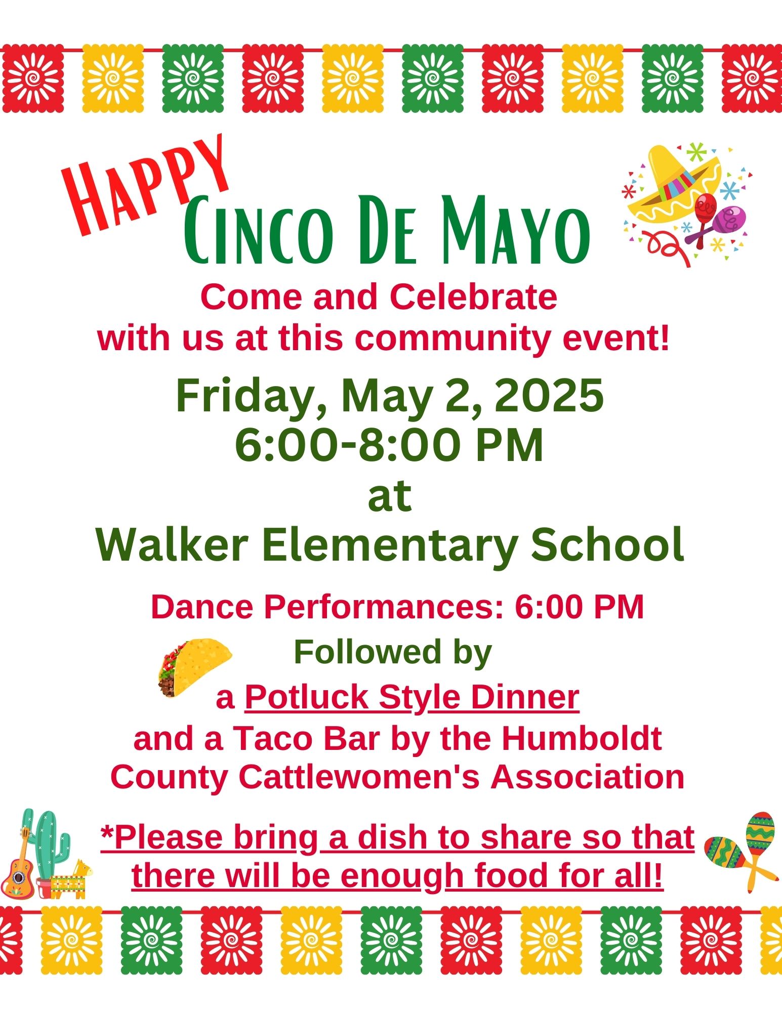 A colorful poster announces a Cinco de Mayo community event at Walker Elementary School on Friday, May 2nd from 6:00-8:00 PM. The event will feature dance performances, a potluck dinner, and a taco bar.